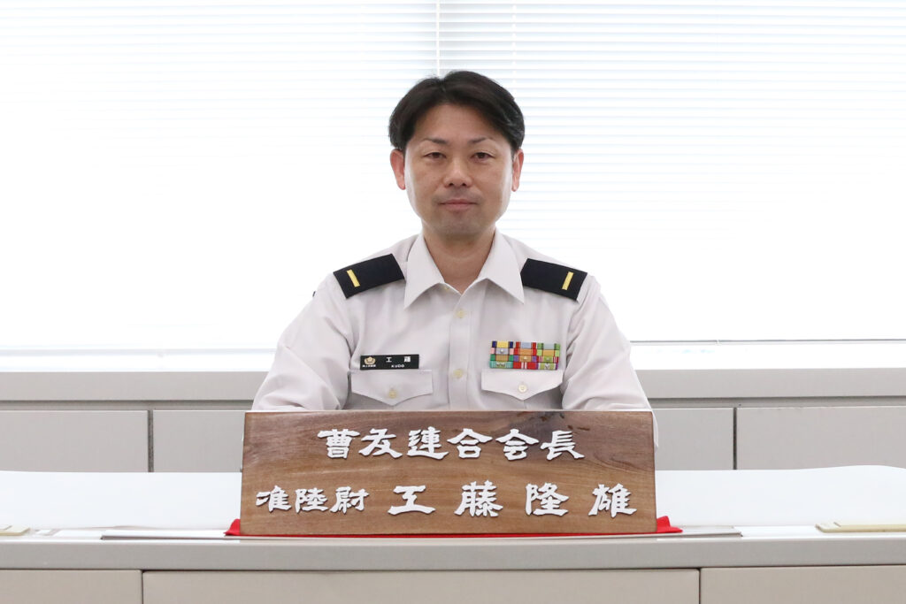 このたび、第15代曹友連合会長に就任しました工藤です。 曹友会は、隊員同士がつながり、支え合い、前向きな気持ちを持てる場でありたいと考えています。そのためにも、役員だけではなく、会員の皆様お一人お一人が主役となり、それぞれの関わり方で本会活動に参加していただければ幸いです。行事への参加や会誌への投稿など、「できるときに、できる形」で構いません。皆様の声や行動が積み重なることで、曹友会はより身近で、活力のあるものになっていくと信じています。 今後とも、変わらぬご理解とご協力を賜りますよう、よろしくお願い申し上げます。